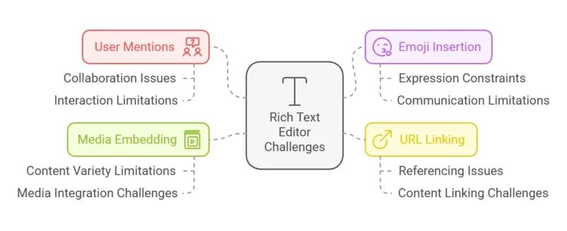 In modern web applications, rich text editors play a crucial role in providing users with a seamless content creation experience. However, our application faced significant limitations with the existing rich text editor, which hindered user engagement and content richness. Users were unable to mention other users, add emojis, link URLs, or embed images and videos, leading to frustration and decreased usability.
